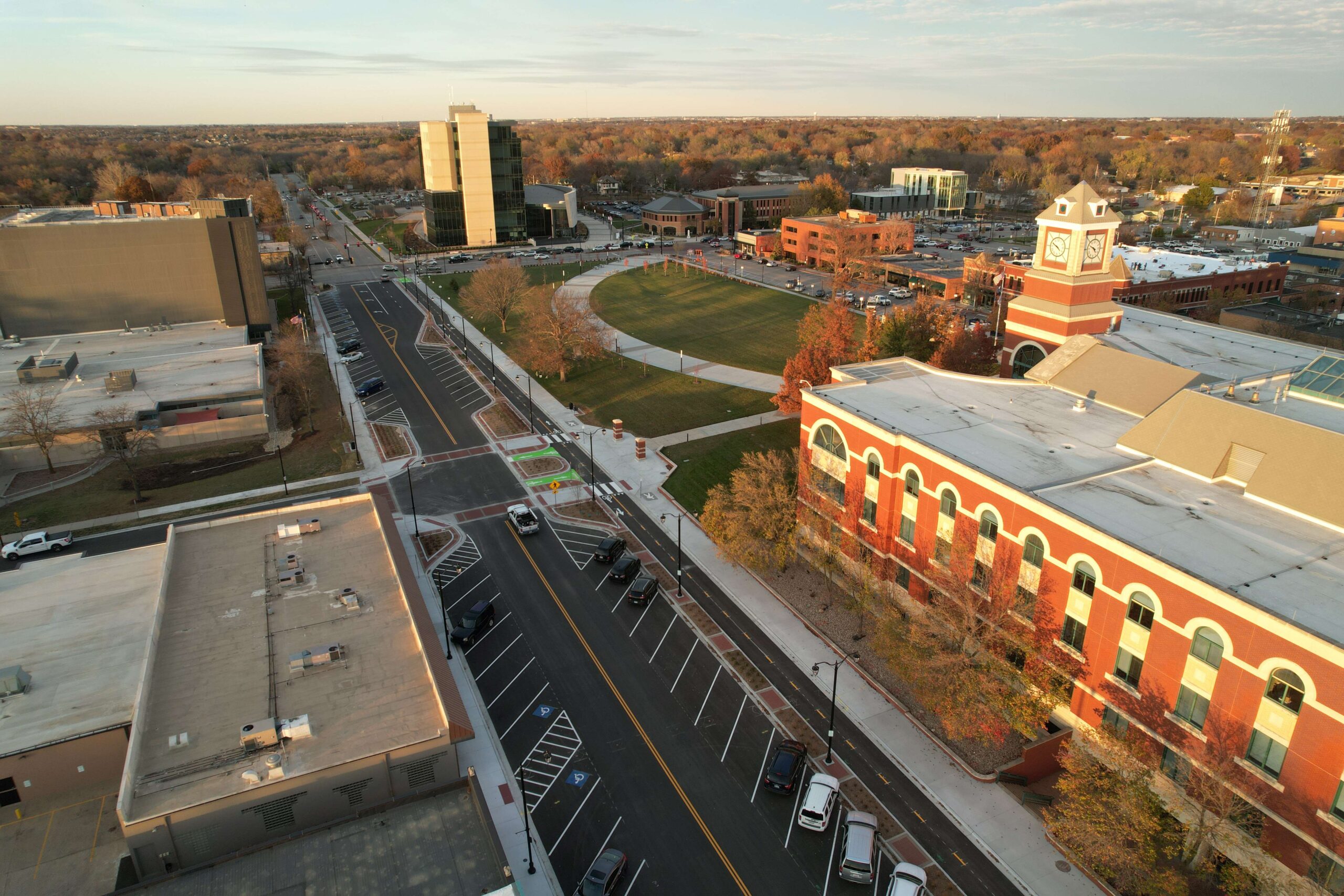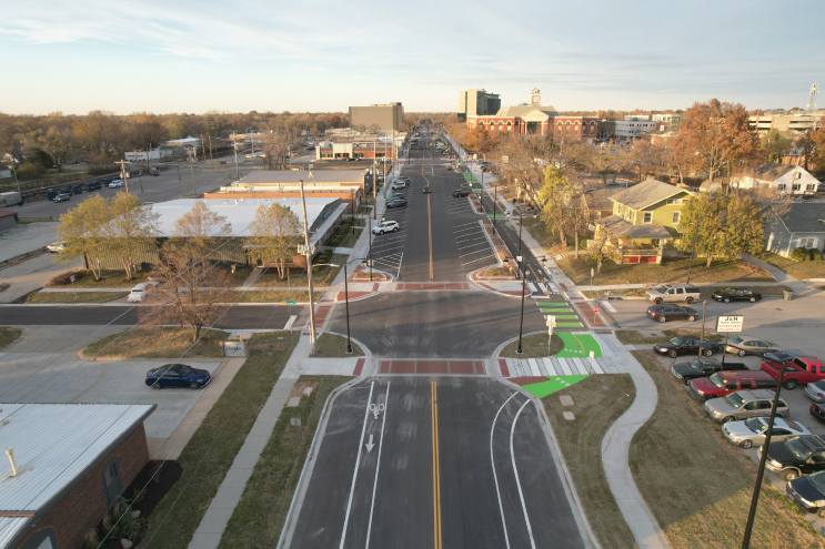 GBA also has extensive experience designing pedestrian, bicycle, and other Safe Systems facilities. Completed in 2023, the Kansas Avenue Streetscape project reimagined a major roadway through the heart of downtown Olathe, Kansas. The project added the first separated two-way cycle track in the state of Kansas, improving safety and multimodal transportation through the area.