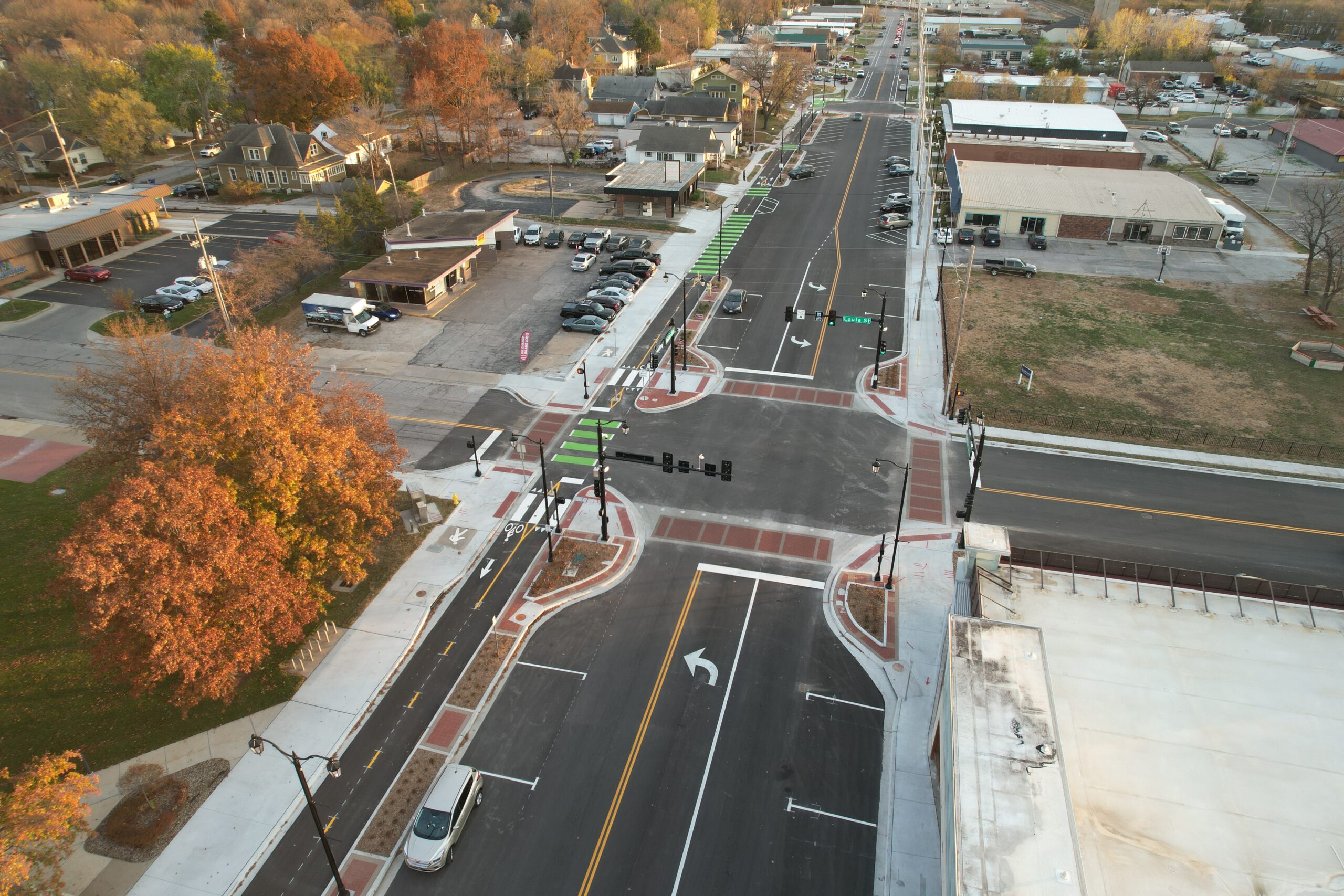 Similarly, the South Liberty Parkway Roundabout Feasibility Study examined locations and configurations of roundabouts on an undeveloped corridor in Liberty, Missouri. The study highlighted the safety benefits of the recommended roundabouts compared to traditional signalized intersections. The conceptual design integrated the existing sidewalk and shared-use path, while including enhanced crosswalks to improve multimodal safety at the roundabouts. This proposed roundabout corridor will help lower vehicular speeds, reduce fatal and injury crashes, and provide safe crossings and facilities for all users.